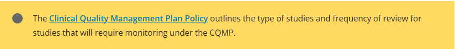 The conduct of rigorous, trustworthy clinical research requires a robust process to monitor research quality. The Clinical Quality Management Program (CQMP) provides a framework to oversee prospective, consenting clinical research studies that do not have external or internal monitoring procedures. The CQMP policy requires that relevant studies overseen within the DUHS IRB receive routine, standardized monitoring by trained quality management (QM) reviewers within their local clinical research unit. Each study that falls within the policy must have an individualized, approved CQMP plan that includes regulatory and participant chart reviews at standardized intervals. QM reviewers receive regular training in how to develop clinical quality management plans, conduct regulatory file and participant chart reviews, and enter quality review reports into a centralized database. CQMP plans and quality reviews focus on key quality indicators including essential regulatory binder documents, participant consent, eligibility, safety reporting, and study data integrity.
